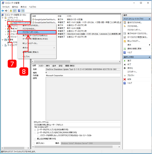 【6】.「7) タスクスケジューラ ライブラリ」上で右クリックし、「8) タスクのインポート」をクリックします。