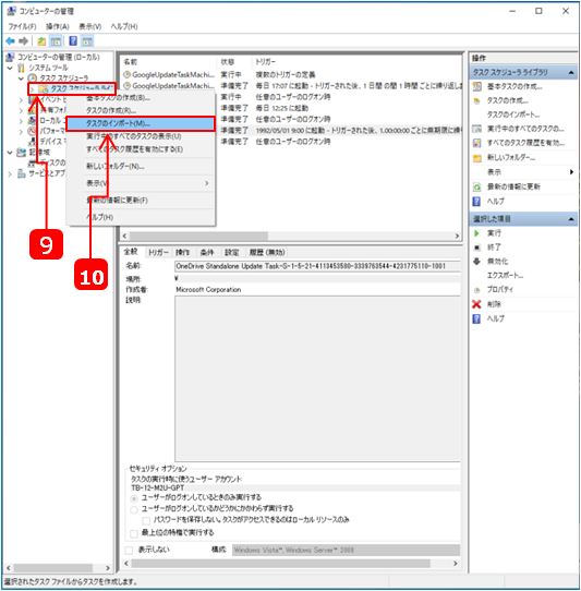 【6】.「9) タスクスケジューラ ライブラリ」上で右クリックし、「10) タスクのインポート」をクリックします。