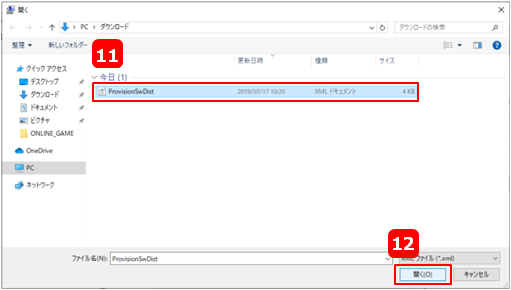 【7】.【5】でダウンロードした「11) ProvisionSwDist」をクリックし、「12) 開く」をクリックします。
