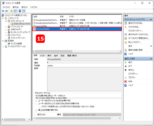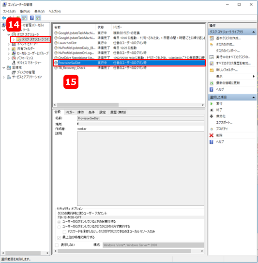 【9】.「14) タスクスケジューラ ライブラリ」をクリックし、中央にタスクの一覧が表示されますので「15) ProvisionSwDist」が表示されるか確認します。