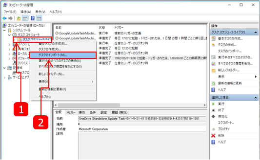 【1】.「1) タスクスケジューラ ライブラリ」上で右クリックし、「2) タスクのインポート」をクリックします。