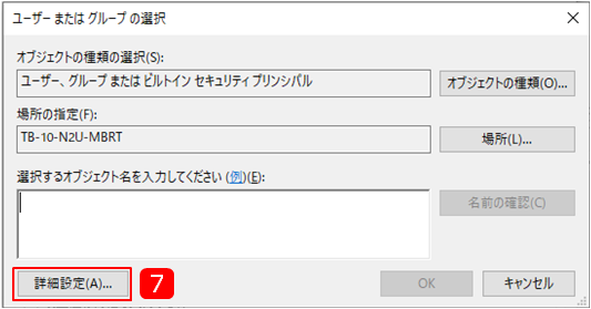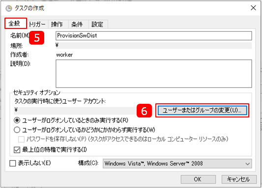 【3】.「5) 全般」タブがデフォルトで表示されますので、「6) ユーザーまたはグループの変更」をクリックします。