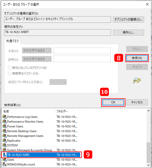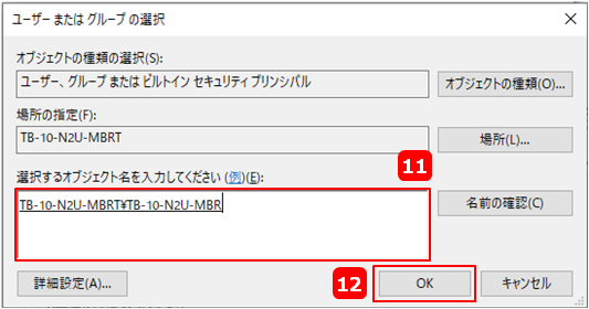 【6】.「11) 選択するオブジェクト名を入力してください」に「 9) 」で選択したPC名が、表示されている事を確認し、「12) OK」をクリックします。