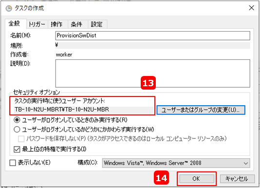 【7】.「13) タスクの実行時に使うユーザーアカウント」に「 9) 」で選択したPC名が表示されている事を確認し、「14) OK」をクリックします。
