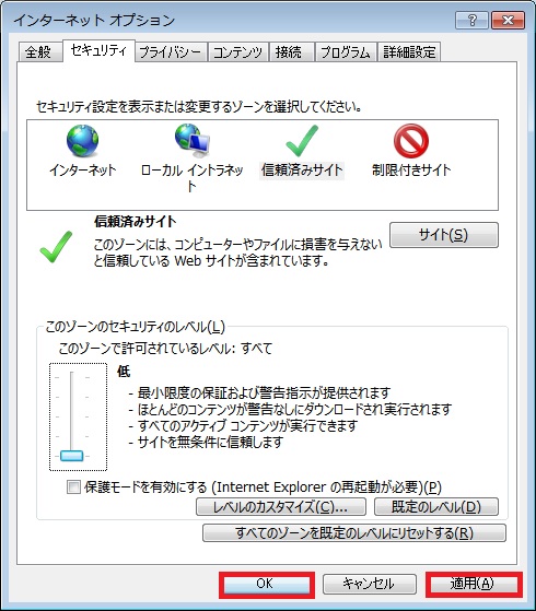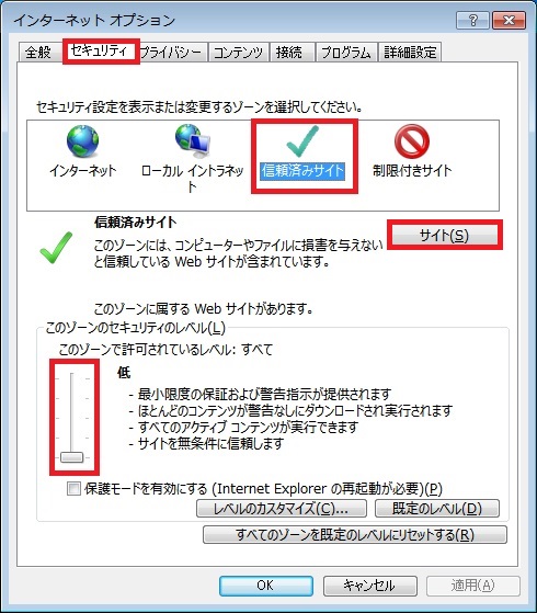 左下のバーを一番下にし、セキュリティレベルを「低」にします。