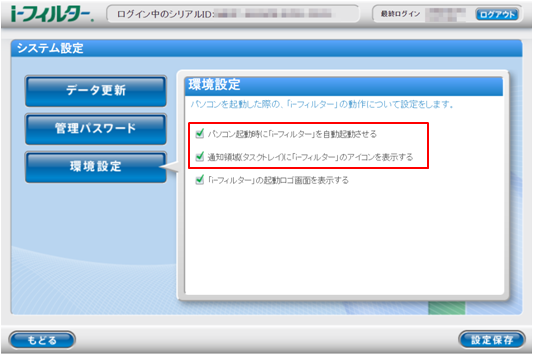 →管理画面の設定で[パソコン起動時に「i-フィルター」を自動起動させる]と、