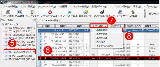 対象PCに 「⑥.☑」 を入れ 「⑦.レベル設定」をクリックし「⑧.任意のグループを選択」します。