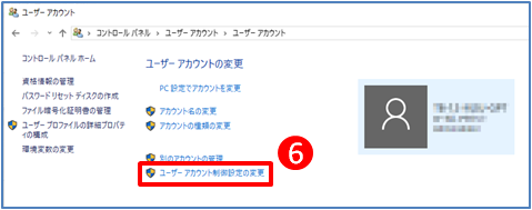 ⑥.「ユーザーアカウント制御設定の変更」をクリックします。