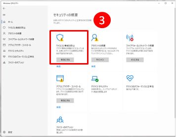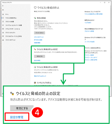④. ウイルスと脅威の防止の設定の項目を確認し、「設定の管理」をクリックします。