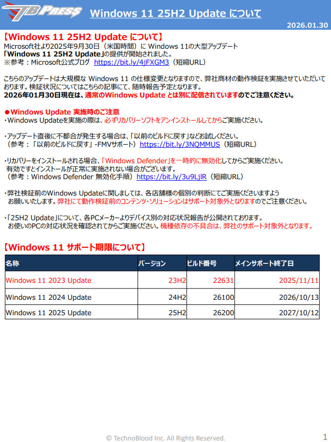 【重要】Windows 11 25H2 Update 対応状況について
